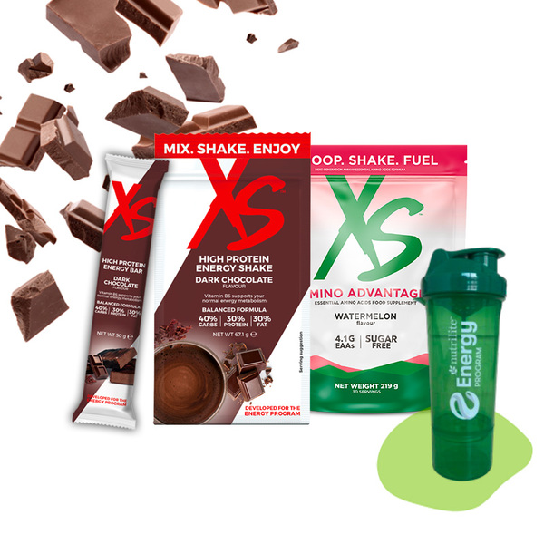 Paketet innehåller nya XS™ Amino Advantage+, XS™ High Protein Energy Bar och Shake. De nya bars och shakes som ingår i paketet fungerar som stöd för din dagliga måltidsplan. Sammansättningarna följer 40-30-30-modellen för näringsbalans. Njut av varje unikt välsmakande tugga och klunk som förser dig med energi under dagen1,2.